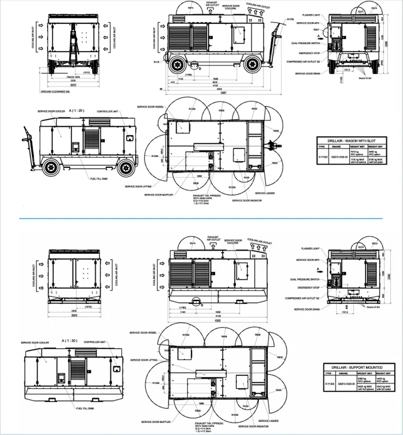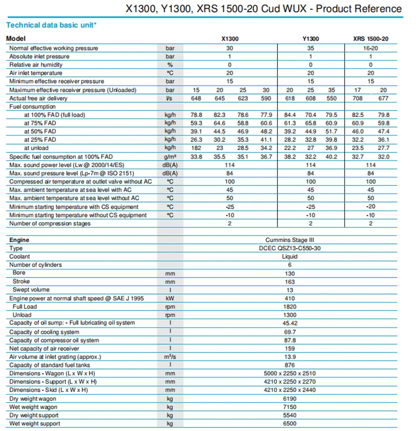 تتميز ضواغط Atlas Copco X1300 وY1300 وXRS 1500-20 بأنها صامتة، وهي عبارة عن ضواغط لولبية محقونة بالزيت على مرحلتين، ومدعومة بمحرك ديزل Cummins سداسي الأسطوانات ومبرد بالسائل.