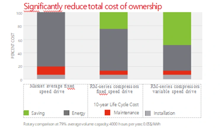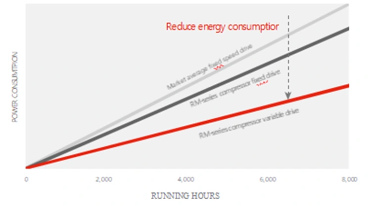 تم تجهيز كل ضاغط هواء من سلسلة RM بوحدة رئيسية جديدة تمامًا وعالية الكفاءة، تجمع بين محرك IE3 ذو السرعة الثابتة وتقنية المحرك متغير التردد ECO*-PM VSD IE5، مما يساعدك على توفير ما يصل إلى 12-30% من تكاليف الطاقة.