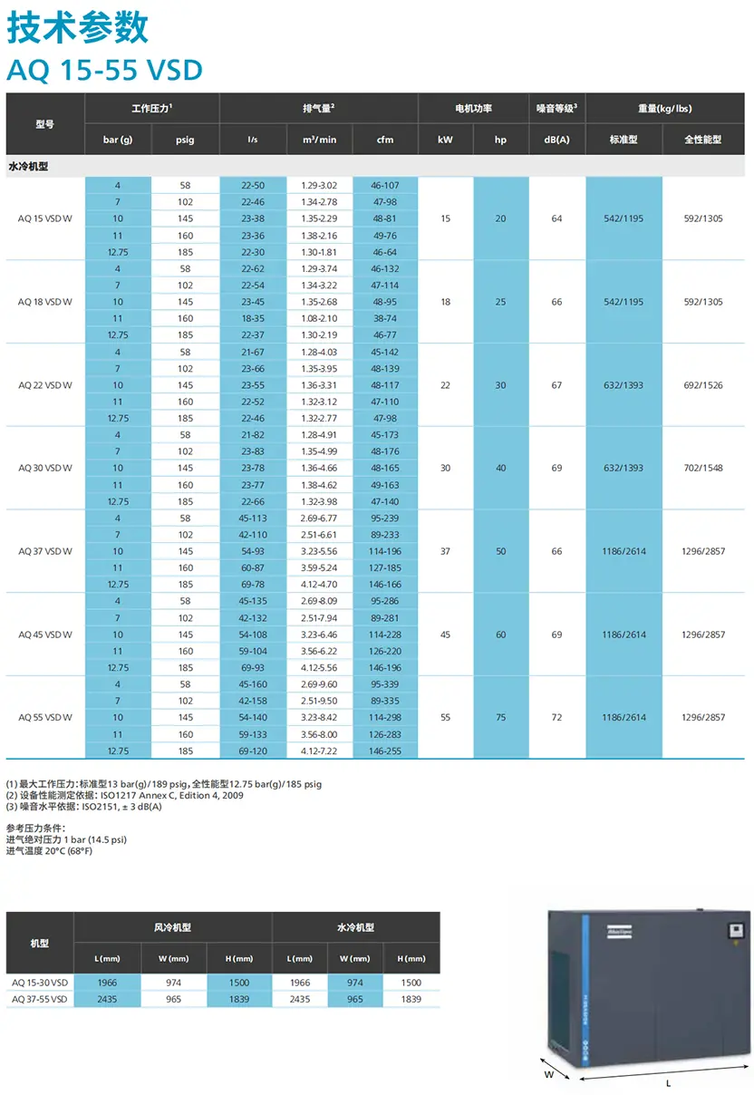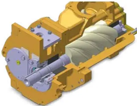 دوار لولبي مزدوج لحقن الماء من سلسلة AQ، تشغيل فعال أقرب إلى الضغط متساوي الحرارة. دوار مركب بوليمر عالي القوة، ملف تعريف دوار محسّن ومحامل مشحمة بالماء يضمن عدم تلوث الدوار بالزيت وإنتاج هواء مضغوط نقي خالٍ من الزيت.