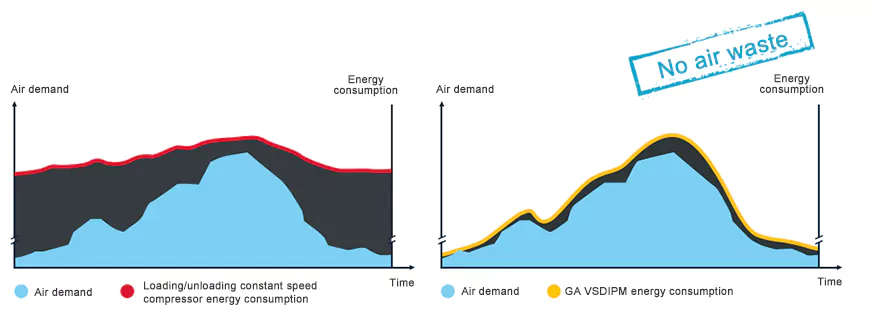 يمكن لسلسلة VSDiPM من Atlas Copco ضبط سرعة المحرك تلقائيًا للتحكم بدقة وتلبية متطلبات استخدام الغاز للعملاء. بالمقارنة مع الضواغط التي يتم تشغيلها بالسرعة المحددة، فإن ضاغط الهواء ذو التردد المتغير VSD يوفر ما يصل إلى 35% من الطاقة في المتوسط.